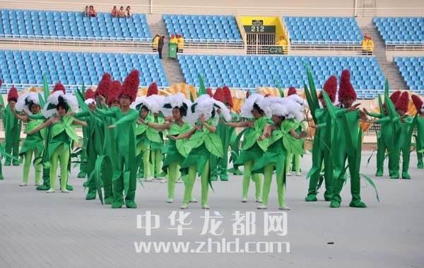 當(dāng)日16時(shí)30分許,伴隨著悠揚(yáng)的鐘聲,文體表演第一章“龍騰歡歌”拉開(kāi)序幕,幾百名身著盛裝,手拿花環(huán)、紅綢的演員從4個(gè)方向快速向市體育場(chǎng)中心表演場(chǎng)地飛奔而去,在音樂(lè)聲中盡情舞蹈。表演隊(duì)伍中最吸引觀眾眼球的是一群身穿泥泥狗造型服裝的演員,他們獨(dú)特的表演十分引人注目。同樣出現(xiàn)在演出現(xiàn)場(chǎng)的還有擔(dān)經(jīng)挑、旱船、竹馬等反映周口獨(dú)特文化資源的文化元素,這些無(wú)疑成了第一章的最大亮點(diǎn)。