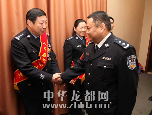 ????報告會前,周口市委常委、政法委書記朱家臣,副市長劉國連,市政府黨組成員、公安局長姚天民親切會見了報告團成員并合影留念。