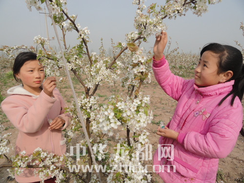 ???????4月12日,商水縣舒莊鄉(xiāng)北王張村的小學(xué)生在自家的梨園為梨花授粉。星期天,該村的小學(xué)生紛紛跑到梨園欣賞盛開的梨花,幫助家長(zhǎng)為梨花授粉,享受著在梨花中勞動(dòng)的樂趣。