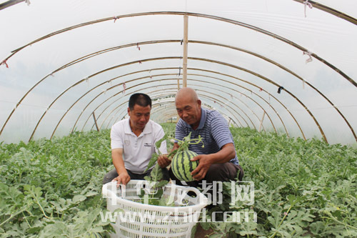 ??  近日,項(xiàng)城市南頓鎮(zhèn)大棚西瓜基地開(kāi)園,培育的“半截樓”8428西瓜,因果瓤脆嫩、味甜多汁走俏市場(chǎng)。該基地?fù)碛写笈?0多個(gè),占地面積120多畝,畝均收入2萬(wàn)多元。圖為該基地工作人員在采摘西瓜?! 。ǚ簿颁h 攝)