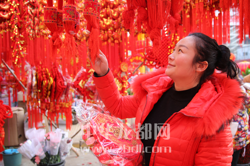 ????2月4日,在項(xiàng)城市水寨辦事處的一家商鋪前,市民正在挑選吊飾。新年臨近,當(dāng)?shù)匕傩占娂姷绞袌錾线x購鮮切花、紅燈籠、中國結(jié)等節(jié)日飾品。 張永久 攝