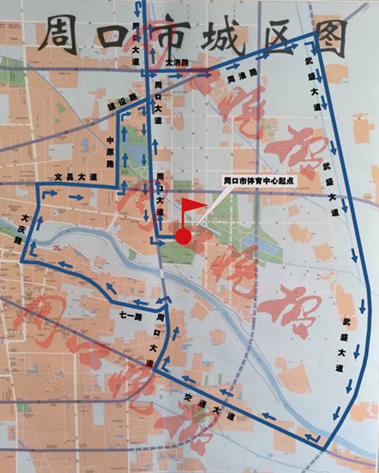 ????賽事初步確定報名參賽總?cè)藬?shù)為1萬人,其中,全程馬拉松2000人,半程馬拉松2000人,迷你馬拉松6000人。比賽路線(如圖)暫定為:市體育中心(起點)——周口大道——北高速口轉(zhuǎn)折——太清路——周淮路——武盛大道——周項路——周口大道——七一路——大慶路——文昌大道——中原路——建設(shè)路——周口大道——市體育中心(終點)。
