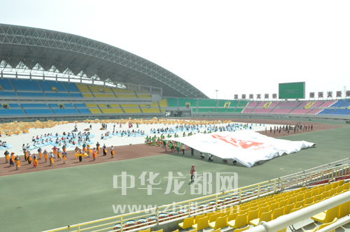 參加我市第三屆運(yùn)動(dòng)會(huì)開幕式的演職人員在體育場(chǎng)彩排