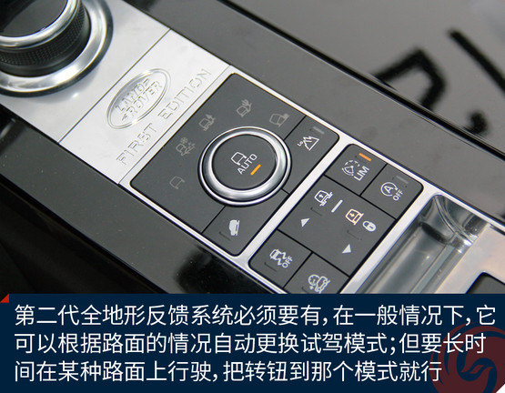 第二代全地形反饋系統(tǒng)必須有,它的特點(diǎn)是在任何非AUTO模式下,且車速低于50公里/時(shí),車身會自動(dòng)升高75毫米,以此應(yīng)對復(fù)雜越野需求。而全地形反饋系統(tǒng),同時(shí)能夠提升車輛的發(fā)動(dòng)機(jī)、變速箱、中央差速器和底盤的性能,使駕駛者可以根據(jù)具體地形選擇合適的駕駛模式。