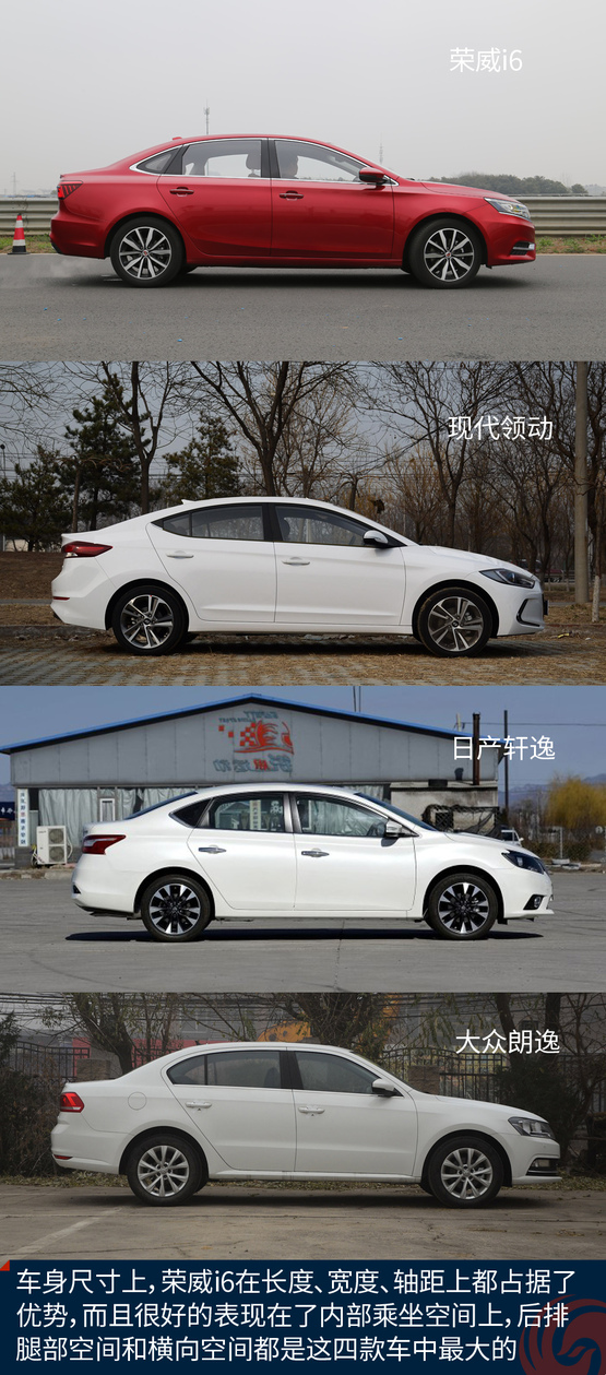 從上面的表格可以看出,榮威i6的長(zhǎng)寬高分別為4671*1835*1460mm,在寬度和長(zhǎng)度上,都要優(yōu)于其他三款車。特別是車寬,達(dá)到了1835mm,橫向的寬度不僅可以提升視覺(jué)效果,對(duì)車內(nèi)橫向空間也影響很大,尤其是后排乘坐3人的時(shí)候。在軸距上,榮威i6以2715mm的數(shù)據(jù)表現(xiàn),穩(wěn)居第一位。