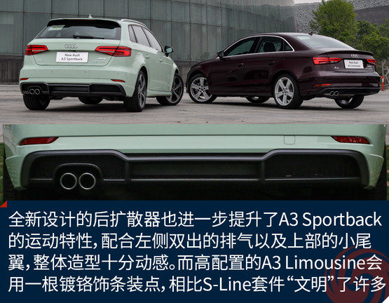 全新設(shè)計的后擴(kuò)散器也進(jìn)一步提升了A3 Sportback的運(yùn)動特性,配合左側(cè)雙出的排氣以及上部的小尾翼,整體造型十分動感。而高配置的A3 Limousine會用一根鍍鉻飾條裝點(diǎn),相比S-Line套件“文明”了許多。與LED矩陣大燈相呼應(yīng)的是全LED尾燈,兩者相輔相成為新車帶來了更強(qiáng)的攻擊性以及橫向視覺延展性,新加入的流動式轉(zhuǎn)向燈在美觀的同時也提升了整車的科技感。
