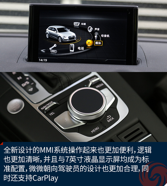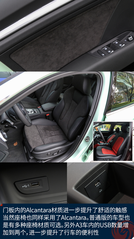 相比較外觀的改變,內(nèi)飾的變化就要少了一些,最直觀的變化莫過于全新設(shè)計的真皮方向盤,不僅好看也十分的好用,發(fā)光的迎賓踏板進(jìn)一步增加了車輛的高級感,中控面板上的鋁合金材質(zhì)的裝飾條質(zhì)感出色,不僅如此,還有多種樣式和材質(zhì)可選;而門板內(nèi)的Alcantara材質(zhì)進(jìn)一步提升了舒適的觸感,當(dāng)然座椅也同樣采用了Alcantara。另外新增加的USB接口也進(jìn)一步增加了行車的便利性,這也讓A3車內(nèi)的USB數(shù)量增加到兩個。同時,全新設(shè)計的MMI系統(tǒng)操作起來也更加便利,邏輯也更加清晰,并且與7英寸液晶顯示屏均成為標(biāo)準(zhǔn)配置,微微朝向駕駛員的設(shè)計也更加合理,同時還支持CarPlay。