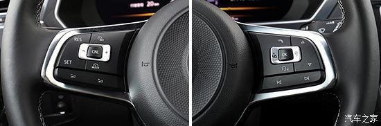三輻式真皮方向盤造型與國產(chǎn)版本存在一定差異,中間部分采用圓形設計,且邊緣鑲嵌帶有R-Line標識的銀色飾條,視覺效果更加動感、精致。方向盤圈輻偏細,好在真皮材質較為細膩,握感更趨向舒適,而下方采用平底造型,能夠為駕駛員營造更充足的腿部空間。除了常見的音量調(diào)節(jié)和行車電腦切換等功能外,背面還帶有換擋撥片,“不幸”的是,Tiguan的變速箱天資聰慧,用到它的幾率比較有限。
