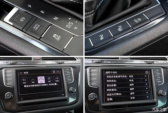 電子手剎和泊車輔助等功能按鍵移至擋把周圍,使用非常順手且布局緊湊。然而亮點在于后方的路況及駕駛模式選擇旋鈕,前者分為雪地、公路、越野和越野個性化四種模式,雖然樣式不同,不過功能和此前的OFF ROAD非常相似,遇到非鋪裝路可直接切換至該模式,剩下的由其自動完成,同時顯示屏中還可反饋車輛信息。而“越野個性化”模式卻是首次出現(xiàn),顧名思義可自行設定轉向、驅動裝置及空調(diào)等工作狀態(tài)。