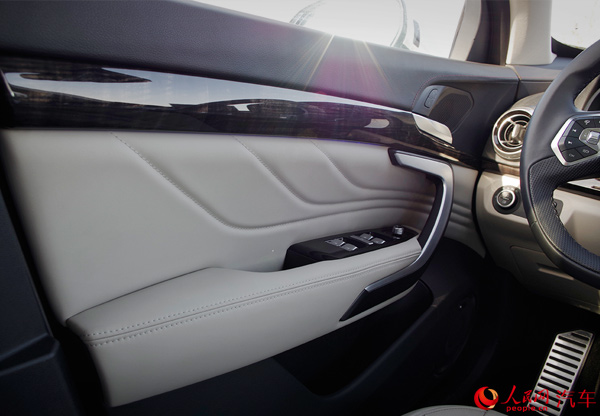 再細(xì)看VV7的內(nèi)飾做工與用料,能發(fā)覺(jué)它確實(shí)很用心。不僅中控臺(tái)質(zhì)感不錯(cuò),在車(chē)門(mén)板內(nèi)側(cè)各處也采用了材質(zhì)細(xì)膩的皮質(zhì)包裹層,門(mén)把手、按鍵都透露出精致感。WEY這款方向盤(pán)非常粗壯,包裹的皮質(zhì)手感很好,不過(guò)按鍵的布局和標(biāo)注并不能讓你一下就明白操作,需要適應(yīng)。