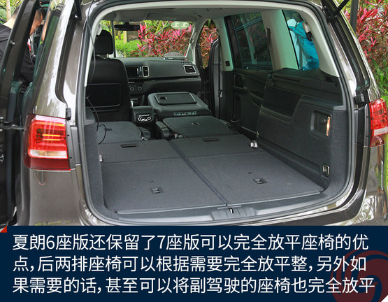 同時(shí),夏朗6座版還保留了7座版可以完全放平座椅的優(yōu)點(diǎn),后兩排座椅可以根據(jù)需要完全放平整,只不過(guò)6座版在第二排中間會(huì)有個(gè)洞,不像7座版那么完美。另外如果需要的話(huà),甚至可以將副駕駛的座椅也完全放平,將夏朗變成一款“商用車(chē)”。