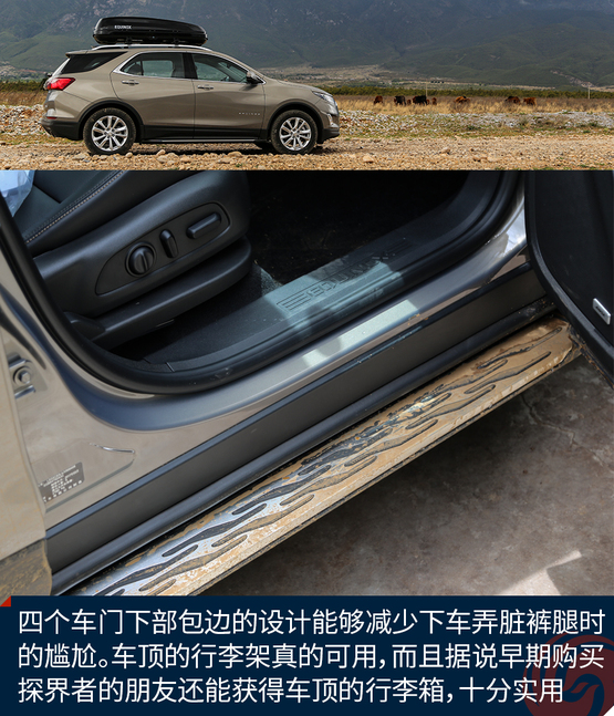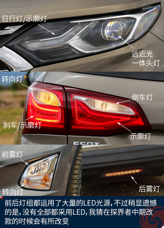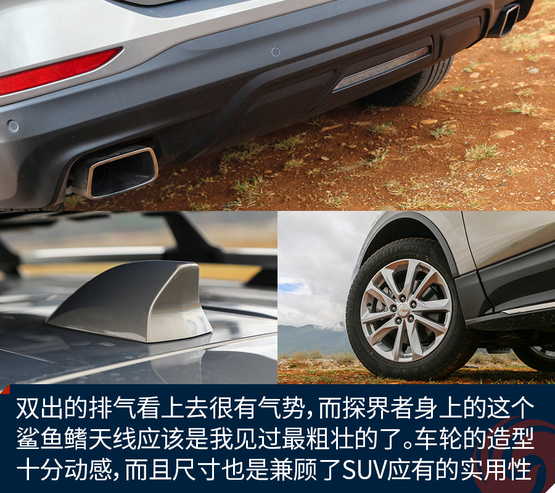 外觀上令我印象深刻的地方有這么幾個,首先前后燈組都運用了大量的LED光源,不過稍顯遺憾的是,沒有全部都采用LED,我猜在探界者中期改款的時候會有所改變。四個車門下部包邊的設(shè)計能夠減少下車弄臟褲腿時的尷尬。車頂?shù)男欣罴苷娴目捎?,而且?jù)說早期購買探界者的朋友還能獲得車頂?shù)男欣钕洌謱嵱?。雙出的排氣看上去很有氣勢,而探界者身上的這個鯊魚鰭天線應(yīng)該是我見過最粗壯的了。車輪的造型十分動感,而且尺寸也是兼顧了SUV應(yīng)有的實用性。