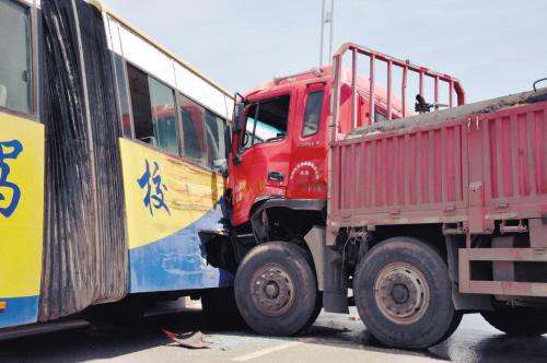 ????????昨日12時許,記者趕到事發(fā)地點:渾南西路與沈蘇西路交會處的渾河站橋。只見一輛紅色車身的運水罐車與一輛藍黃相間的大客車相撞!