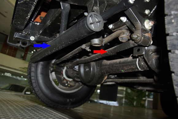 ????后軸特寫圖二,藍色箭頭所指為拖臂,紅色箭頭所指為后防傾桿,對于衛(wèi)士的車重而已,其粗細不能提供很好的仿側傾效果。后軸依然采用螺旋彈簧作為彈性元件。