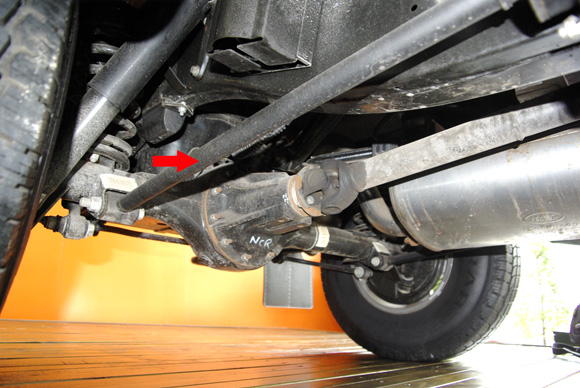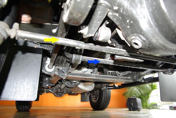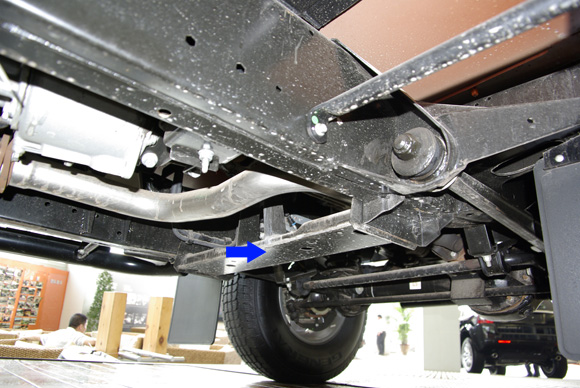 ????上圖中橙黃色箭頭為前軸的限位拉桿,不僅限制前軸自身發(fā)生扭轉,也可對前軸的相對車架的前后位置進行限制。藍色箭頭為前防傾桿,目測粗細并不算大,相信這也跟衛(wèi)士不看重公路性能有關。