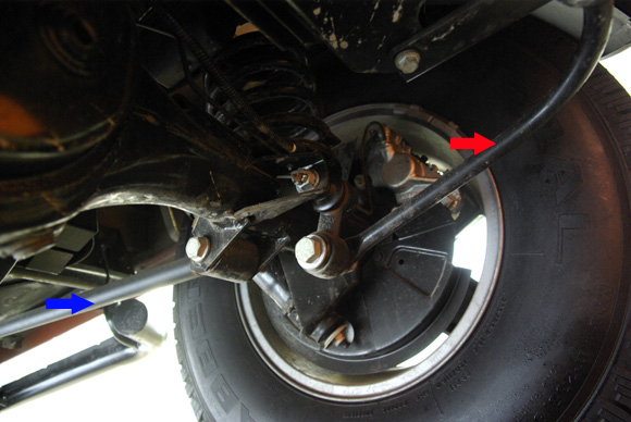 ????衛(wèi)士的后軸采用拖臂式后懸,紅色箭頭所指的拉桿就是拖臂。左右各一根,拖臂及避震機對后軸的自由度進行控制,后軸相對車架的位置和自身的扭轉都得到了控制。
