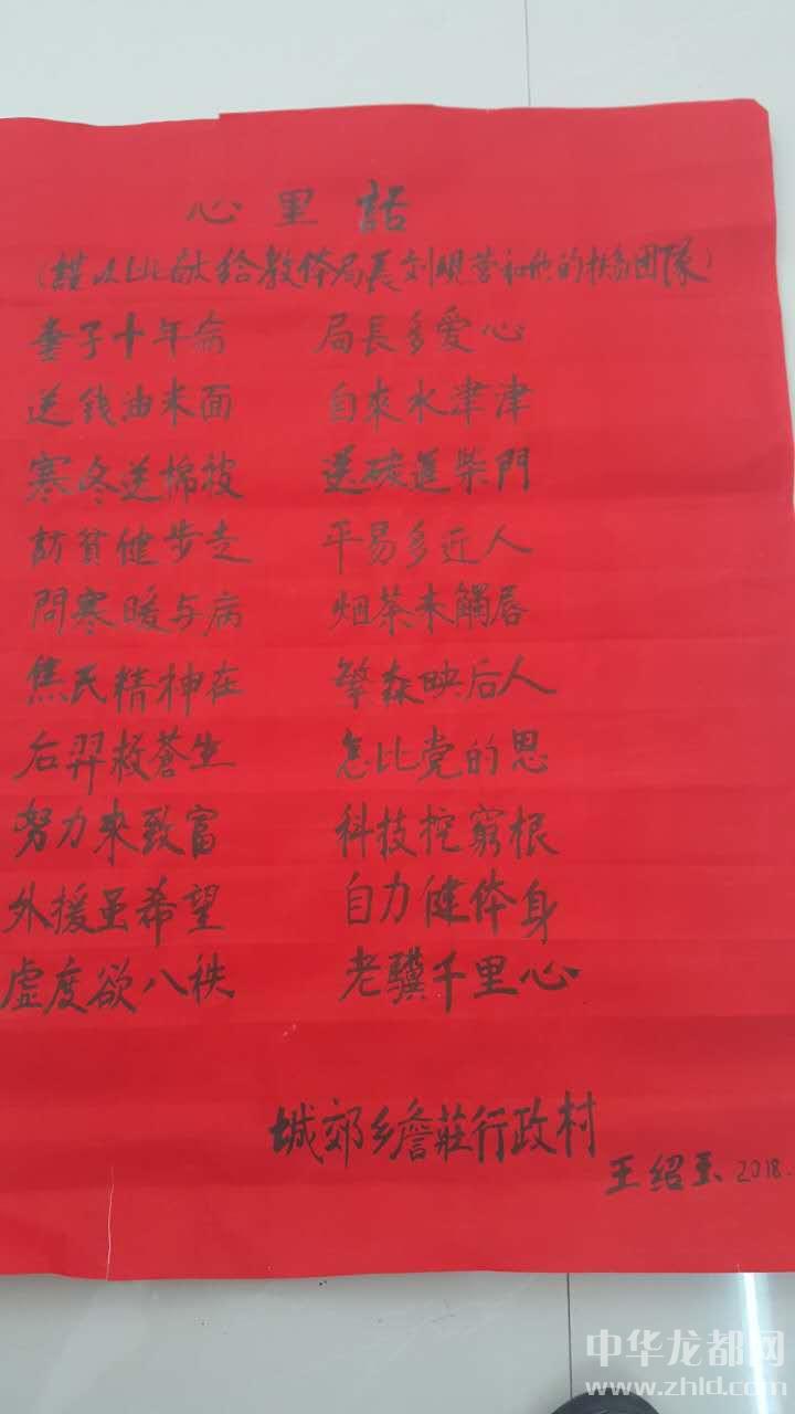 “我推敲了幾個半夜,寫了《心里話——謹以此獻給教體局局長劉現(xiàn)營和他的扶貧團隊》這首五言排律,表表我和老伴及全村對您的感激之情?!薄捌拮邮瓴。珠L多愛心。送錢米油面,自來水津津。寒冬送棉被,送炭至柴門。訪貧健步走,平易又近人?!蓖踅B玉聲情并茂地朗讀著,劉局長爽朗地笑了,“老伴劉桂蘭藥按時吃了嗎?”“按時吃了,多虧您,到我家宣講扶貧政策,幫助我聯(lián)系有關(guān)單位,我老伴享受了慢性病醫(yī)保。”“桂蘭說,人家劉局長隔三差五給咱送米面油,逢年過節(jié)給咱送慰問金,前幾天頂風冒雪送來兩床被子,一年不知來了多少趟,待咱比親人還親?。∥壹乙矝]有什么拿出手的,我倆一合計,就發(fā)揮我的一點專長,給您寫了首詩,您經(jīng)常去我家噓寒問暖,我今個也來您這,算是走走親戚吧,回報回報您!”