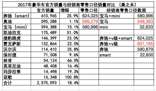 如果以經(jīng)銷商終端零售口徑統(tǒng)計(jì),奔馳(含smart)2017年銷量為624,025輛,其中奔馳品牌(含v級(jí)車)為601,195輛;奧迪品牌為599,279輛;寶馬(含Mini)為580,996輛,其中寶馬品牌為548,363輛;如果以經(jīng)銷商終端零售口徑計(jì)算,奔馳品牌(含v級(jí)車)在2017年豪華車終端零售市場(chǎng)獲得銷售冠軍。