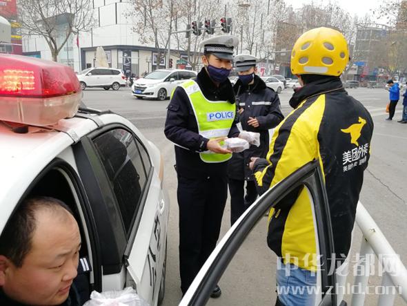 1月24日,在寒風中執(zhí)勤的市公安局交通警察管理支隊直屬一大隊的交警收到美團外賣送來的臘八粥。