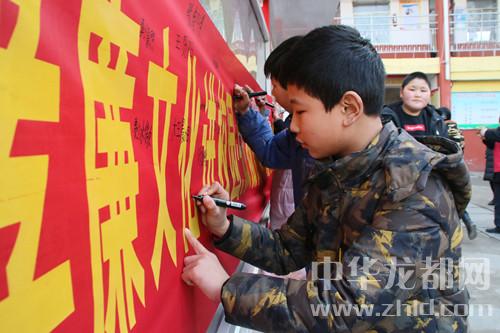中華龍都網(wǎng)訊(周口報業(yè)全媒體記者 韋偉 通訊員 王佳佳 辛曼 攝)今年是毛澤東“向雷鋒同志學習”題詞55周年。3月5月,沈丘縣紀委監(jiān)委聯(lián)合縣義工聯(lián)走進沈丘二高、河南小學,開展“孝廉文化進校園”活動,旨在弘揚雷鋒精神和“孝善儉廉”的美德。圖為:學生們在“弘揚雷鋒精神,做‘孝善儉廉’美德少年”條幅前簽字。
