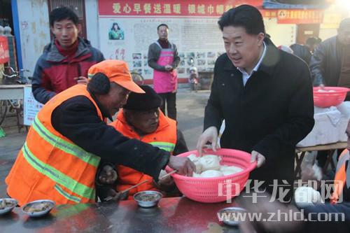 中華龍都網(wǎng)訊(周口報業(yè)全媒體記者 馬治衛(wèi) 通訊員 徐孫楊)3月20日早,新疆河南總商會會長朱軍一行從新疆專程趕往太康,為該縣“愛心早餐”工程捐款10萬元,并親自為環(huán)衛(wèi)工人端菜送饅頭,并向志愿者和環(huán)衛(wèi)工致以親切地慰問。