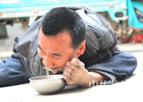 媽媽乘上一碗放在地上,紅印坐在墊子上,用腳夾著勺子,彎下腰來吃得很香??吹郊t印吃飯那么費力,在場人心里酸酸的,為紅印自強(qiáng)不息所打動著??墒钱?dāng)初娘倆可沒少流眼淚,李新蘭發(fā)現(xiàn)兒子兩只腳是靈活完好的,就開始訓(xùn)練他用腳吃飯、洗臉。養(yǎng)大一個正常的孩子尚且不易,何況是張紅印這樣的孩子?李新蘭一遍遍地教,年幼的張紅印一遍遍地學(xué)。難為到受不了時,娘倆就抱在一起哭。