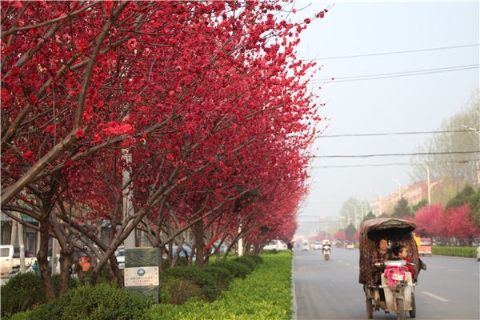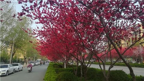 楊樹、垂柳、法桐,這是常見的綠化樹,可是你見過整條道路用桃樹做綠化的嗎?在周口市建設(shè)大道西段,長達(dá)1公里的主干道兩側(cè)種滿桃樹。現(xiàn)在正值陽春三月桃花盛開,整條道路成了一片花的海洋,儼然是鬧市區(qū)里的世外桃源。