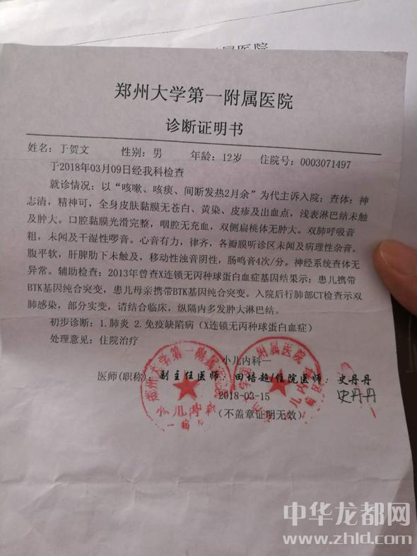 “肺炎、免疫缺陷病(X連鎖無丙種球蛋白血癥)”,2018年3月15日,來自鄭大一附院的一張化驗單讓于東兩口子徹底崩潰了。于東說,拉拉扯扯求醫(yī)四五年,有時候檢測結果證明是孩子先天性免疫力低下,疑似造血功能不完善,但他不敢相信。由于家庭貧困,他們四處借債在縣、鄉(xiāng)、村三級醫(yī)院救治。