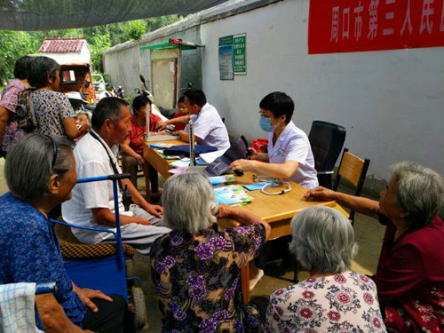 中華龍都網(wǎng)訊(周口報業(yè)全媒體記者 高洪馳 通訊員 李四軍)6月22日,周口市第三人民醫(yī)院組織該院外科、內(nèi)科和中醫(yī)科醫(yī)護人員,走進川匯區(qū)文莊社區(qū),舉辦“健康扶貧巡回義診”活動,免費為村民送醫(yī)、送藥、送健康,受到文莊村民的歡迎。