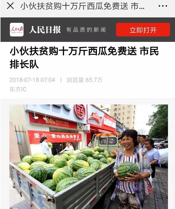 7月18日,《人民日報》客戶端播發(fā)了“小伙購十萬斤西瓜免費(fèi)送 市民排長隊”的一條新聞,瞬間刷屏朋友圈,一天閱讀量就突破100萬人次,加上騰訊新聞、人民圖片截至19日發(fā)稿時閱讀量已達(dá)一百五十萬人次,評論13000多條,人們都在稱贊咱扶溝小伙宋鐵托的善舉,被網(wǎng)友稱他為“愛心西瓜哥”。