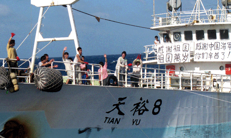 看到海口艦,“天裕8號(hào)”船員就像見(jiàn)到了久違的親人,紛紛走上甲板,歡呼著向??谂灀]手致意,并在船上升起一面鮮艷的五星紅旗。他們年齡大約在二十歲左右,在甲板上行走如飛,如履平地一般。