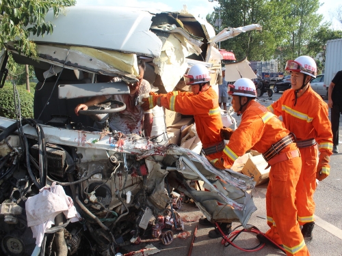 救援人員到達(dá)事故現(xiàn)場后看到,一輛依維柯小型貨車與一輛小型罐車發(fā)生激烈碰撞。小型貨車車頭嚴(yán)重變形,事故現(xiàn)場一片狼藉,玻璃碎片、鐵皮、散落一地,駕駛室內(nèi)司機(jī)被牢牢卡在座椅上不能動彈。