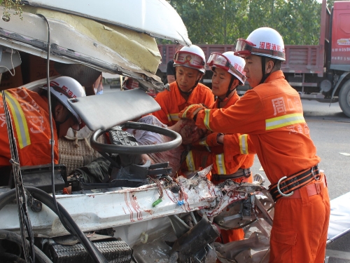 消防官兵一邊對現(xiàn)場進(jìn)行警戒,一邊實施破拆營救。由于車頭嚴(yán)重變形,沒有有利救援支撐的空間,給救援帶來很大的困難。指揮員決定利用機(jī)動擴(kuò)張剪與液壓頂桿對駕駛室進(jìn)行擴(kuò)張,待撐出有效救援空間后,迅速對被困人員進(jìn)行施救。