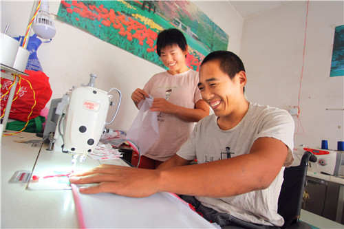 生意閑的時候,朱建舟又和妻子商量,借錢購買了兩臺縫紉機,幫助附近一家工廠加工環(huán)保袋。加工活雖然不累,但對于雙腿殘疾的朱建舟來說卻很困難。一向愛動腦筋的朱建舟自己動手把縫紉機踏板改裝成手動式的,大大提高了工作效率?!耙粋€月能掙2000多元錢,還能顧家,照顧病人和孩子?!蓖跷迥菪睦镉姓f不出的高興。