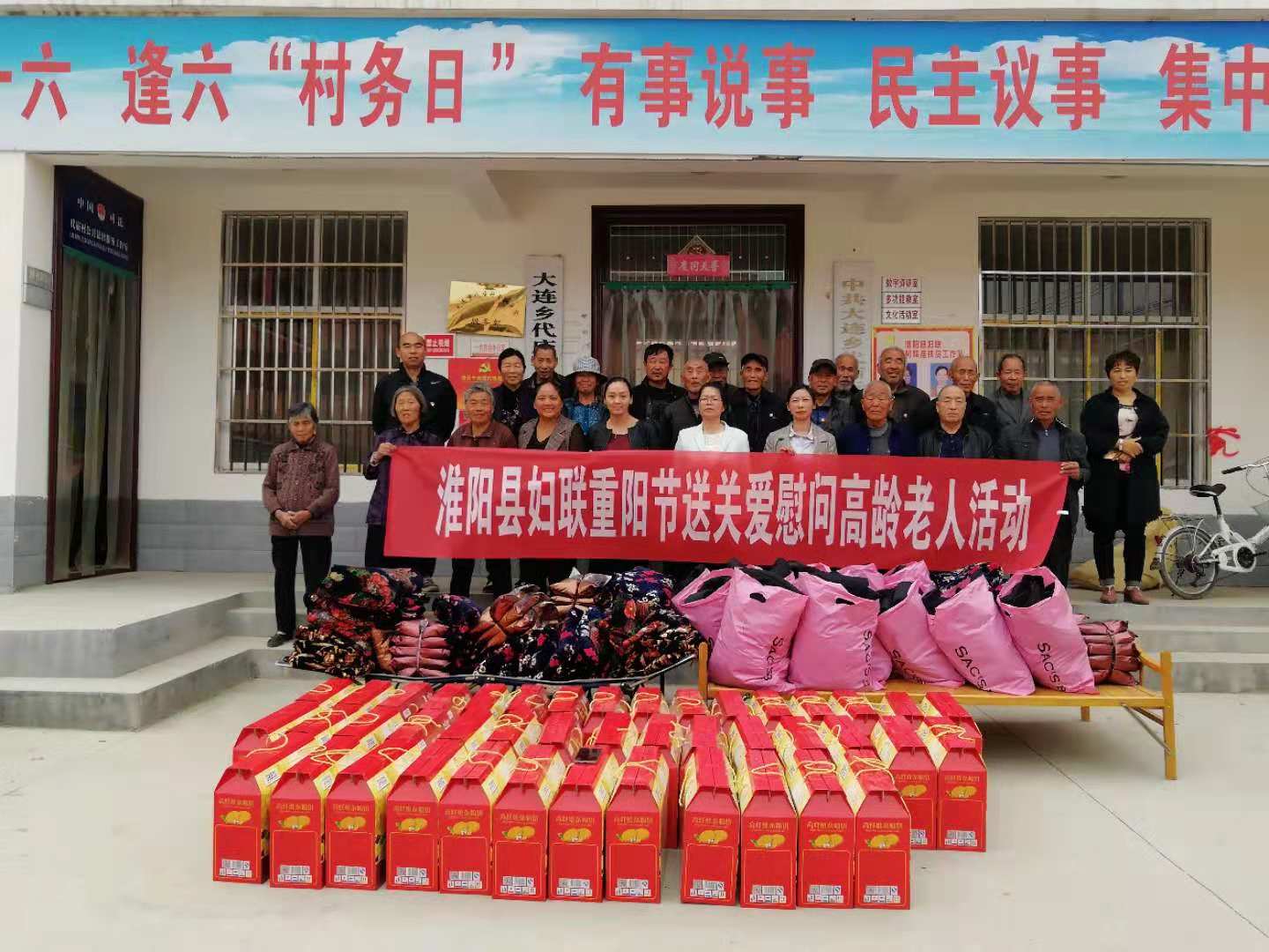 10月14日,淮陽縣婦聯(lián)駐大連鄉(xiāng)代廟行政村工作隊(duì)在代廟村開展每月農(nóng)歷逢六主題黨日系列活動(dòng)。為進(jìn)一步深化黨性教育活動(dòng)效果,縣婦聯(lián)結(jié)合即將而至的重陽節(jié),帶領(lǐng)黨員對(duì)全村43戶85歲以上高齡老人進(jìn)行了逐一看望慰問,為每位老人送上一套高級(jí)棉襖、棉被,一件高纖維雜糧餅和親切的節(jié)日問候,共送去價(jià)值7000元的慰問品。