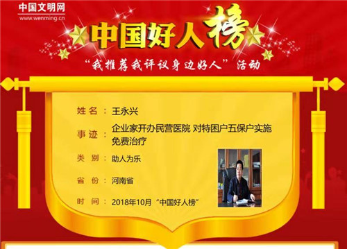 太康縣農(nóng)家出身的王永興熱心公益,累計(jì)投資高達(dá)數(shù)千萬(wàn)元。10月31日上午,10月中國(guó)好人榜發(fā)布儀式暨全國(guó)道德模范與身邊好人現(xiàn)場(chǎng)交流活動(dòng)在江蘇連云港舉行,太康縣王永興榮登10月份助人為樂(lè)類(lèi)“中國(guó)好人榜”。據(jù)悉,太康縣入選“中國(guó)好人榜”人數(shù)已達(dá)42人。