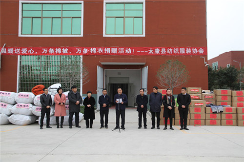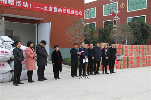 太康縣委副書記、政法委書記王程清在致辭中指出,扶貧濟困、樂善好施是中華民族的傳統(tǒng)美德,通泰紡織、銀鑫棉業(yè)、萬利源棉業(yè)等縣紡織協(xié)會成員單位通過捐款捐物、產(chǎn)業(yè)幫扶、就業(yè)幫扶、基礎(chǔ)設(shè)施幫扶等多種形式投入到脫貧攻堅行動中,幫助貧困群眾發(fā)展生產(chǎn)、改善生活條件、擺脫疾病困擾、完成學(xué)業(yè)夢想、為貧困群眾早日脫貧貢獻出自己的一份力量,并為他們捐贈棉衣棉被的善舉表示感謝。