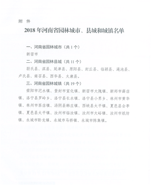 其中,新密市1地被命名為河南省園林城市,太康縣、西華縣、尉氏、淇縣、延津縣、原陽(yáng)縣等11個(gè)縣被命名為河南省園林城市,登封市宜化鎮(zhèn)、新密市大隗鎮(zhèn)、新鄭市薛店鎮(zhèn)等19個(gè)鄉(xiāng)鎮(zhèn)被評(píng)為河南省園林城鎮(zhèn)。