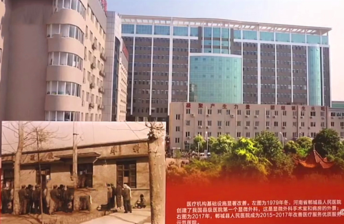 河南電視臺記者陳貞君在展覽板前介紹,這里是位于第四展區(qū)的兩幅同一所醫(yī)院的照片——河南省鄲城縣人民醫(yī)院,這張是1979年冬天,鄲城縣人民醫(yī)院創(chuàng)建了我國縣級醫(yī)院第一個顯微外科,這就是當時的顯微外科的手術(shù)室和病房的外景,這張是2017年的鄲城縣人民醫(yī)院??梢哉f改革開放讓同一所醫(yī)院有了滄海桑田般的變遷。