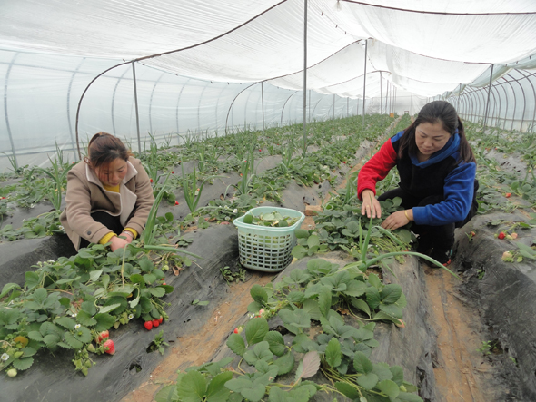 2月27日,商水縣鄧城鎮(zhèn)返鄉(xiāng)創(chuàng)業(yè)標(biāo)兵、鎮(zhèn)人大代表馮杰(右)對草莓進(jìn)行疏葉管理。馮杰在鎮(zhèn)人大、工商聯(lián)幫助下創(chuàng)辦了生態(tài)葡萄園,并種植了溫室草莓,安排了50名貧困戶就業(yè)。