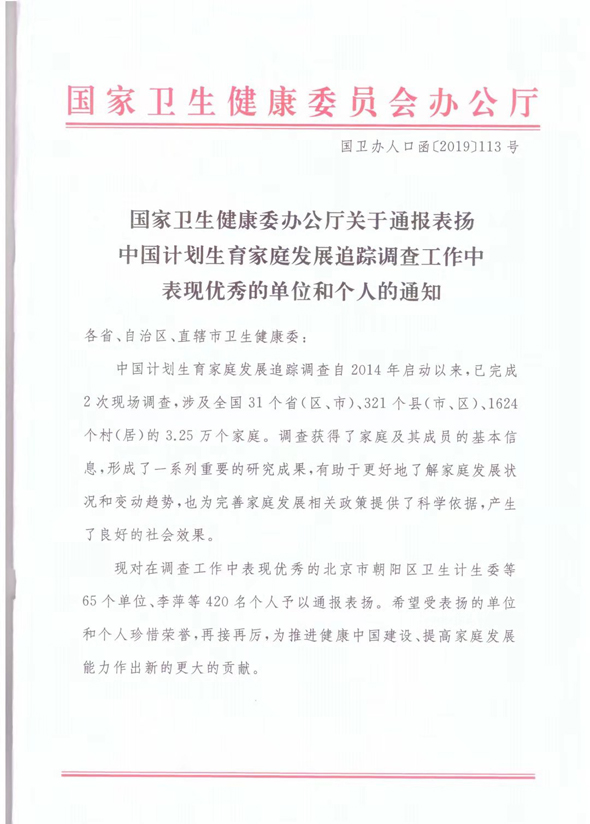 通知顯示,中國計(jì)劃生育家庭發(fā)展追蹤調(diào)查自2014年啟動以來,已完成2次現(xiàn)場調(diào)查,涉及全國31個(gè)省(區(qū)、市)、321個(gè)縣(市、區(qū))、1624個(gè)村(居)的3.25萬個(gè)家庭。調(diào)查獲得了家庭及其成員的基本信息,形成了一系列重要的研究成果,有助于更好地了解家庭發(fā)展?fàn)顩r和變動趨勢,也為完善家庭發(fā)展相關(guān)政策提供了科學(xué)依據(jù),產(chǎn)生了良好的社會效果。國家衛(wèi)健委對在此項(xiàng)工作中表現(xiàn)優(yōu)秀的65個(gè)單位、420名個(gè)人進(jìn)行通報(bào)表揚(yáng),希望受表揚(yáng)的單位和個(gè)人珍惜榮譽(yù),再接再厲,為推進(jìn)健康中國建設(shè)、提高家庭發(fā)展能力作出新的更大的貢獻(xiàn)。