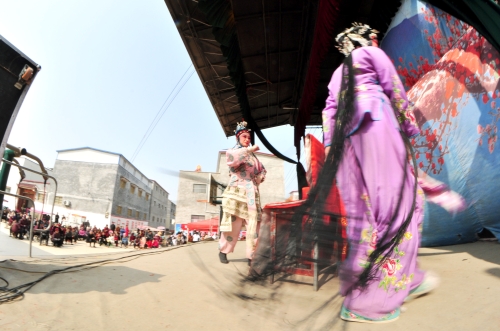 當(dāng)天上午,劇團(tuán)演出的是豫劇《金殿認(rèn)子》,演員們長(zhǎng)年在基層演出,練就一身硬功夫。演員們?cè)谵r(nóng)院內(nèi)化妝,戲服一換,就迅速入戲,生旦凈丑,你來我往,頗見功底的唱腔及其悠長(zhǎng)的韻味,讓戲迷們看得入迷。