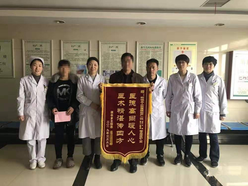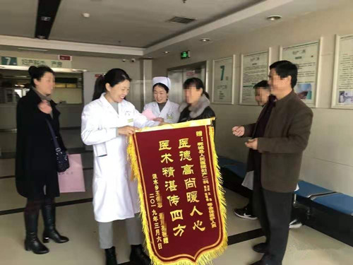 術后患者恢復良好,康復出院后,3月6日上午,患者和丈夫一起來到醫(yī)院,向住院期間給予了精準治療和細心護理的婦產(chǎn)二科王皓主任、張明偉醫(yī)生及全體醫(yī)護人員贈送錦旗,以表謝意。