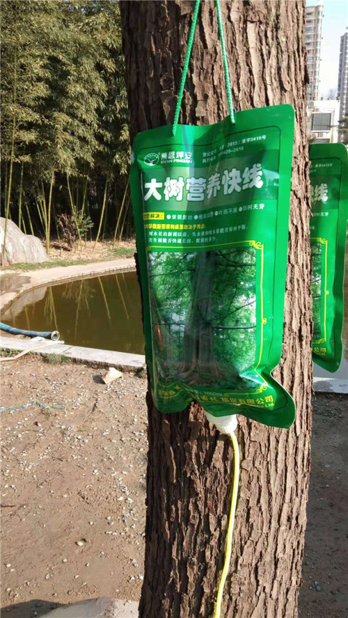 3月18日,記者在市教體局院里看到,幾棵樹上都掛著一個綠色的塑料袋,塑料袋上寫著“大樹營養(yǎng)快線”,袋口向下連著一個導(dǎo)管,導(dǎo)管與普通的輸液器非常相像,只是在中間的位置分成了兩根,分出來的兩根導(dǎo)管末端各連著一個針頭,針頭插進大樹接近樹根的位置。據(jù)悉,這些“營養(yǎng)快線”可以為樹木補充營養(yǎng)和水分,促進樹木生根、發(fā)芽,幫助樹木增強抗病能力,提高樹木的成活率,保證樹木整體長勢。