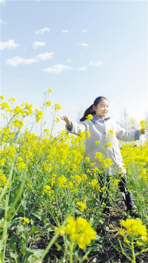 3月31日,記者在中心城區(qū)慶豐路與政通路交叉口附近看到,一位市民帶著孩子在盛開的油菜花里游玩、拍照,盡享春日美景。記者 關秋麗 攝