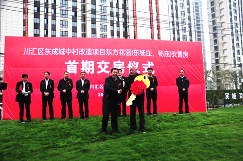 據(jù)介紹,東成城中村改造項目是2014年豫港經(jīng)貿(mào)洽談會重點簽約的5個項目之一,是省、市重點棚戶區(qū)改造項目,涉及川匯區(qū)、經(jīng)濟技術開發(fā)區(qū)2個辦事處3個行政村,總占地4300多畝,其中川匯區(qū)七一路辦事處東楊莊行政村1700多畝。當天交付的東方花園安置房是東楊莊、楊廟安置區(qū)項目,該項目占地102.7畝,總建筑面積23.6萬平方米,總投資6.52億元,建設安置房2010套,同時配建幼兒園1所、地下地上車位1600個、社區(qū)及商業(yè)服務用房1.8萬平方米。該項目于2016年10月26日正式開工建設,經(jīng)過30個月的緊張施工,其中1棟樓208套房達到交付條件正式向回遷群眾交付。預計到7月1日,將再交付6棟樓1112套房,明年“五一”,整個安置區(qū)將全部交工。