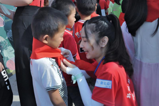 開(kāi)班儀式上,鄭州升達(dá)經(jīng)貿(mào)管理學(xué)院的支教老師為同學(xué)們佩戴了紅領(lǐng)巾,伴隨著國(guó)歌進(jìn)行了升國(guó)旗教育,支教老師進(jìn)行集體宣誓。支教老師代表作表態(tài)發(fā)言時(shí)說(shuō):“很高興能夠來(lái)鹿邑周樓小學(xué)支教,作為一名當(dāng)代青年大學(xué)生,我們能夠擔(dān)當(dāng)重任,吃苦耐勞,全身心地完成兩周的支教活動(dòng),與孩子們快樂(lè)相處?!?/p>
