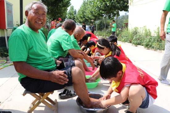 7月的太康,酷熱難耐。6日上午8時(shí)許,一輛公交車穩(wěn)穩(wěn)??吭谔悼h芝麻鄉(xiāng)敬老院門口,車上下來20多名身穿紅馬甲的學(xué)生志愿者,他們抬著米、面、油和雞蛋等物品走進(jìn)敬老院。坐在門口等候的老人們,樂呵呵地上前迎接客人。整個(gè)敬老院一下子熱鬧起來。放下物品,孩子們立馬開始勞動(dòng),他們從老人們宿舍搬出馬扎、板凳,在院中擺放安穩(wěn),扶著老人坐上去,開始給老人洗腳。正上初中一年級(jí)的李博泉細(xì)心地幫72歲的張照志老人摳掉趾甲縫和腳底的污垢。張老漢流淚了:“這輩子有人給我洗腳,我真是不知道哪修來的福氣……”