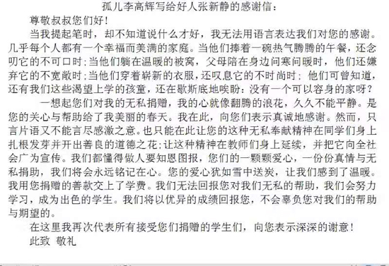 為表示對張新靜等人大代表的感謝,隨后,李高輝給張新靜寫了一封感謝信。信中,他表示,自己一定不辜負(fù)大家的期望,以后會更加努力學(xué)習(xí),回饋社會,回報大家。“他是一個懂得感恩的孩子,讀了他的來信,我感到很欣慰。”張新靜說。