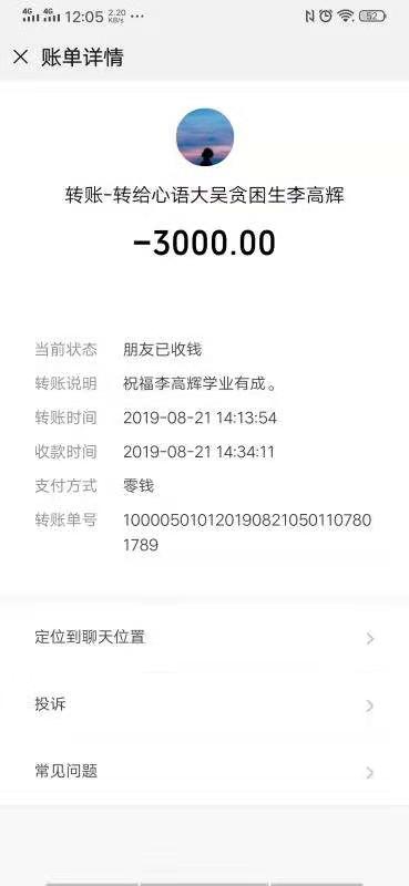 “今后,在學(xué)習(xí)和生活上無論遇到什么困難,只管給我們說,我們會隨時幫助你解決?!睆埿蚂o在與李高輝聊天中再三叮囑李高輝說。隨后,他通過微信給李高輝轉(zhuǎn)來3000元學(xué)費。